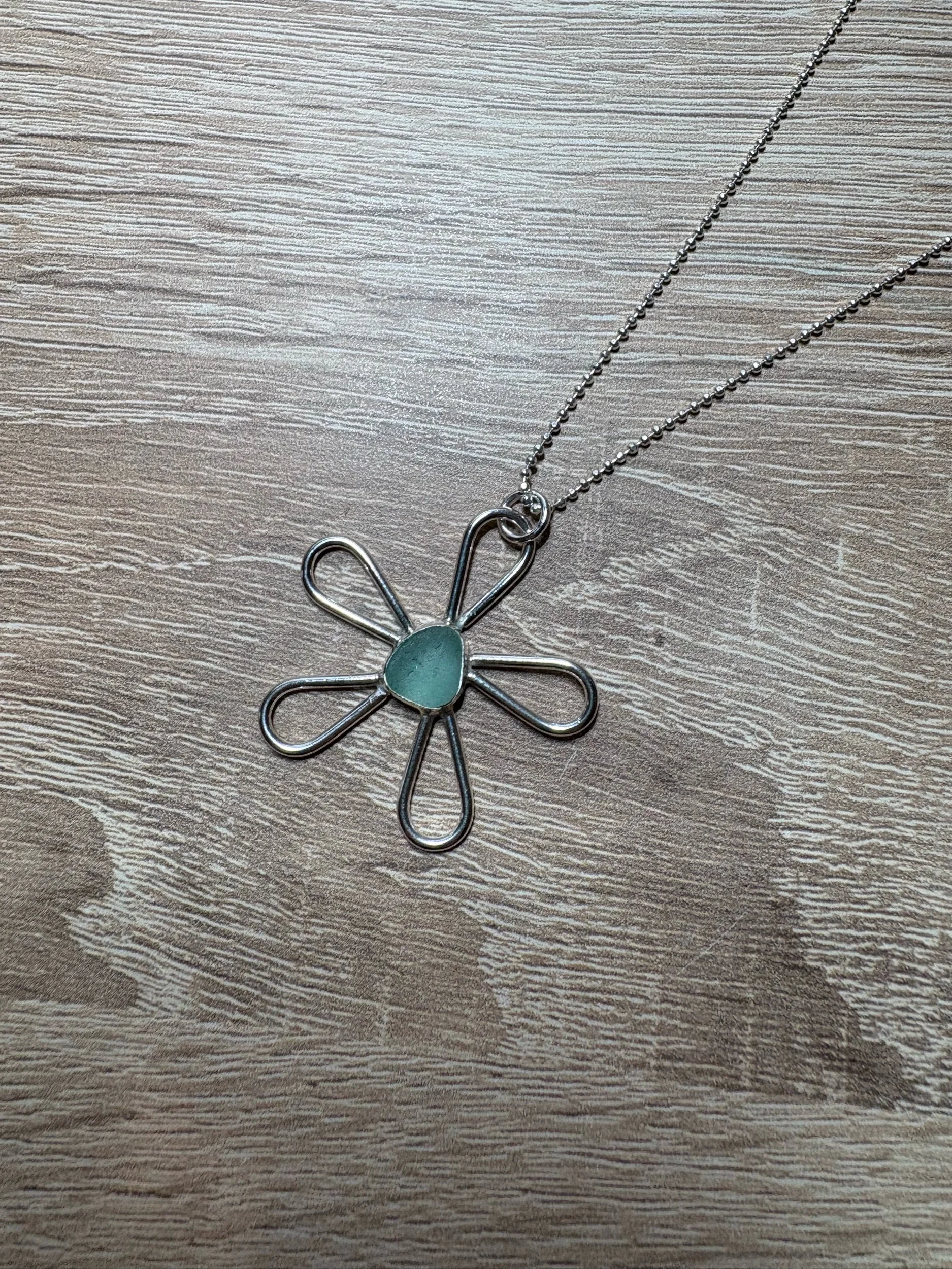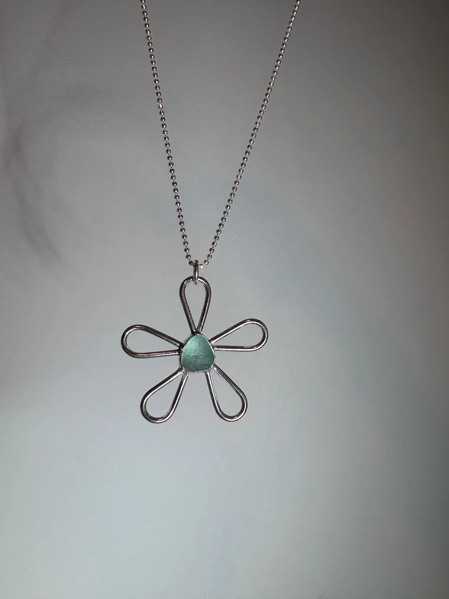 Shop › Fleur necklace Image 1 of 2 Image 2 of 2 Fleur necklace £68.00 Sterling silver flower shaped pendant with a sea foam green sea glass centre, on an 18” sterling silver chain. Add To Cart Added! Sterling silver flower shaped pendant with a sea foam green sea glass centre, on an 18” sterling silver chain.